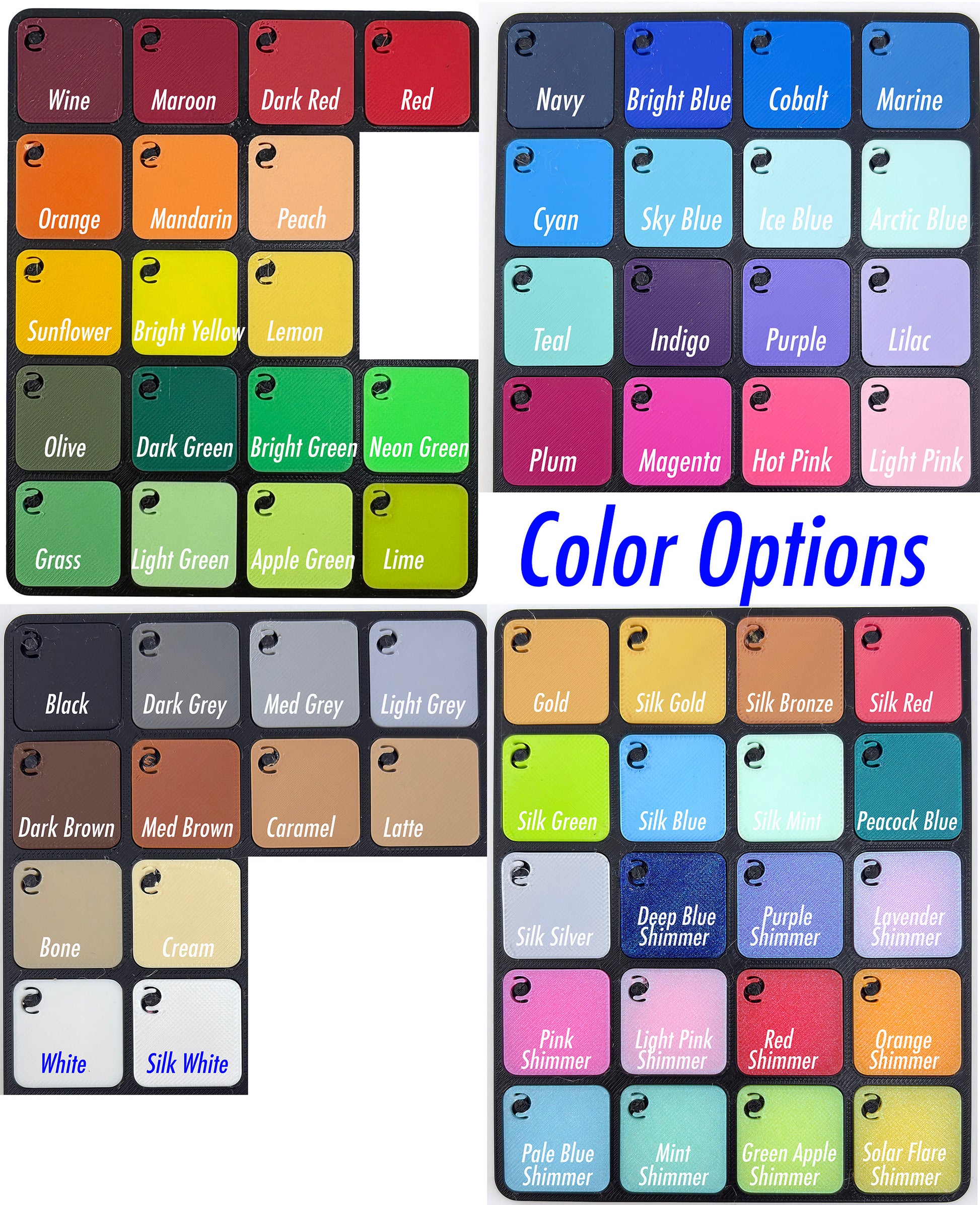 The nametag measures between 3.25" and 4.25" long, depending on font selected and length of name (12 character limit), and .24" (6mm) thick. The cheerleader image is 1.84" high and will be printed in white unless otherwise noted. Select from 50+ colors for the top and bottom layers. Select from 22 different font styles and eight keychain hardware options. See all colors, fonts and hardware options available in the listing photos.